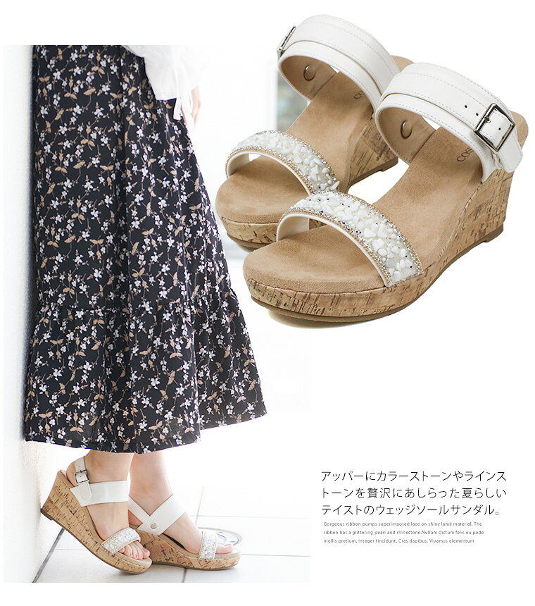 アッパーにカラーストーンやラインストーンを贅沢にあしらった夏らしいテイストのウェッジソールサンダル。