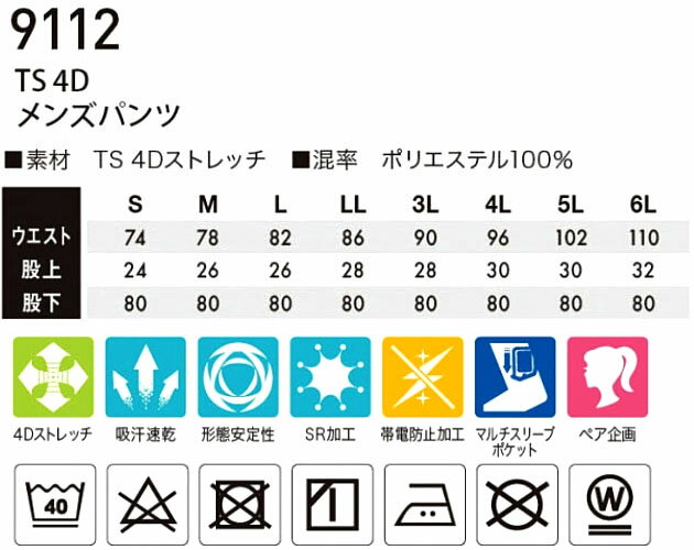 スペック メーカー TS DESIGN(藤和) 品番/シリーズ 9112/911シリーズ シーズン 秋冬物(オールシーズン) 商品名 TS 4Dメンズパンツ 素材 TS 4Dストレッチ 混率 ポリエステル100% 特徴・仕様 吸汗速乾、形態安定性、ストレッチ、帯電防止、防汚性 カラー 25.チャコールグレー 41.ロイヤルブルー 45.ネイビー 95.ブラック サイズ S-6L 加工 ※ご要望の加工は下のバナーをクリックしてお求めくださいませ。